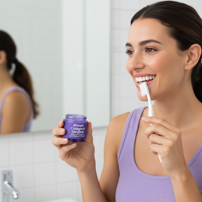 Colágeno Gingival aporta colágeno y minerales esenciales directamente a la línea de las encías mientras te cepillas, ayudando a reforzar y fortalecer el tejido gingival.